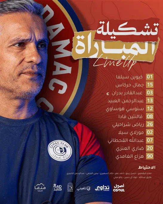 达马克首发:1-科温、12-豪萨维、3-贝德兰、13-奥贝德、15-哈卡斯、26-沙拉里里、2-西拉、20-阿纳齐、7-阿卜杜拉、90-加姆迪、8-瓦达